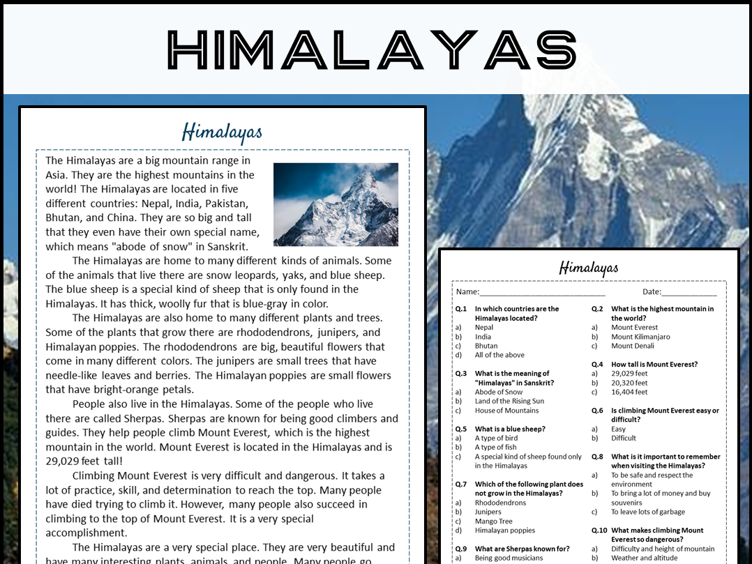 Himalayas Reading Comprehension Passage And Questions PDF Teaching Resources