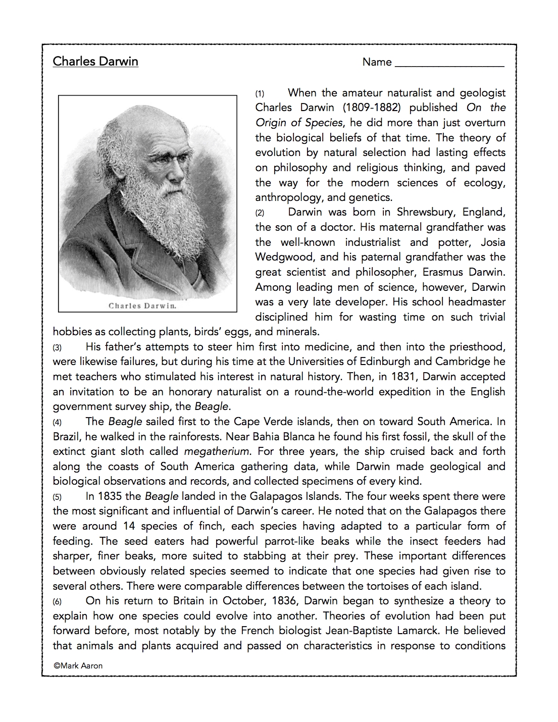 Charles Darwin Reading Comprehension Passage And Assessment Classful