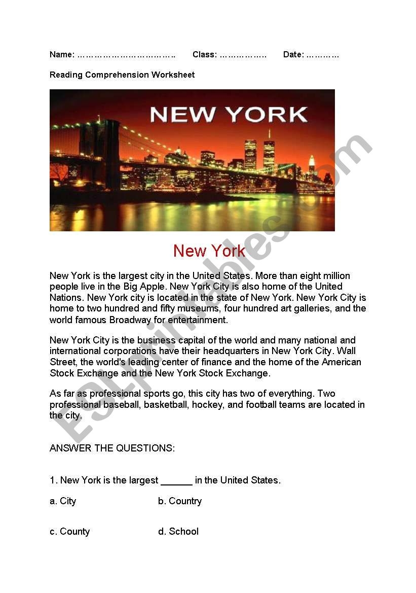 New York City Reading Comprehension Worksheets