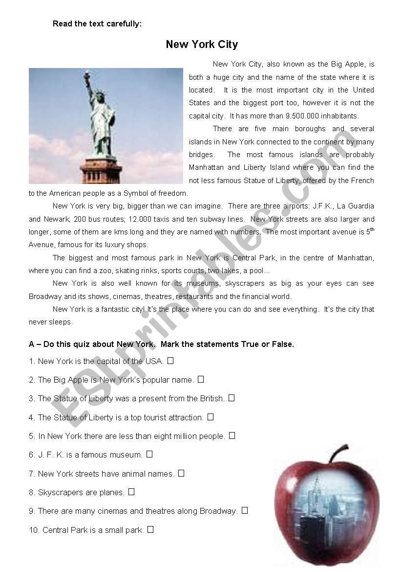 Reading Comprehension NEW YORK ESL Worksheet By SUPERBUBBLE