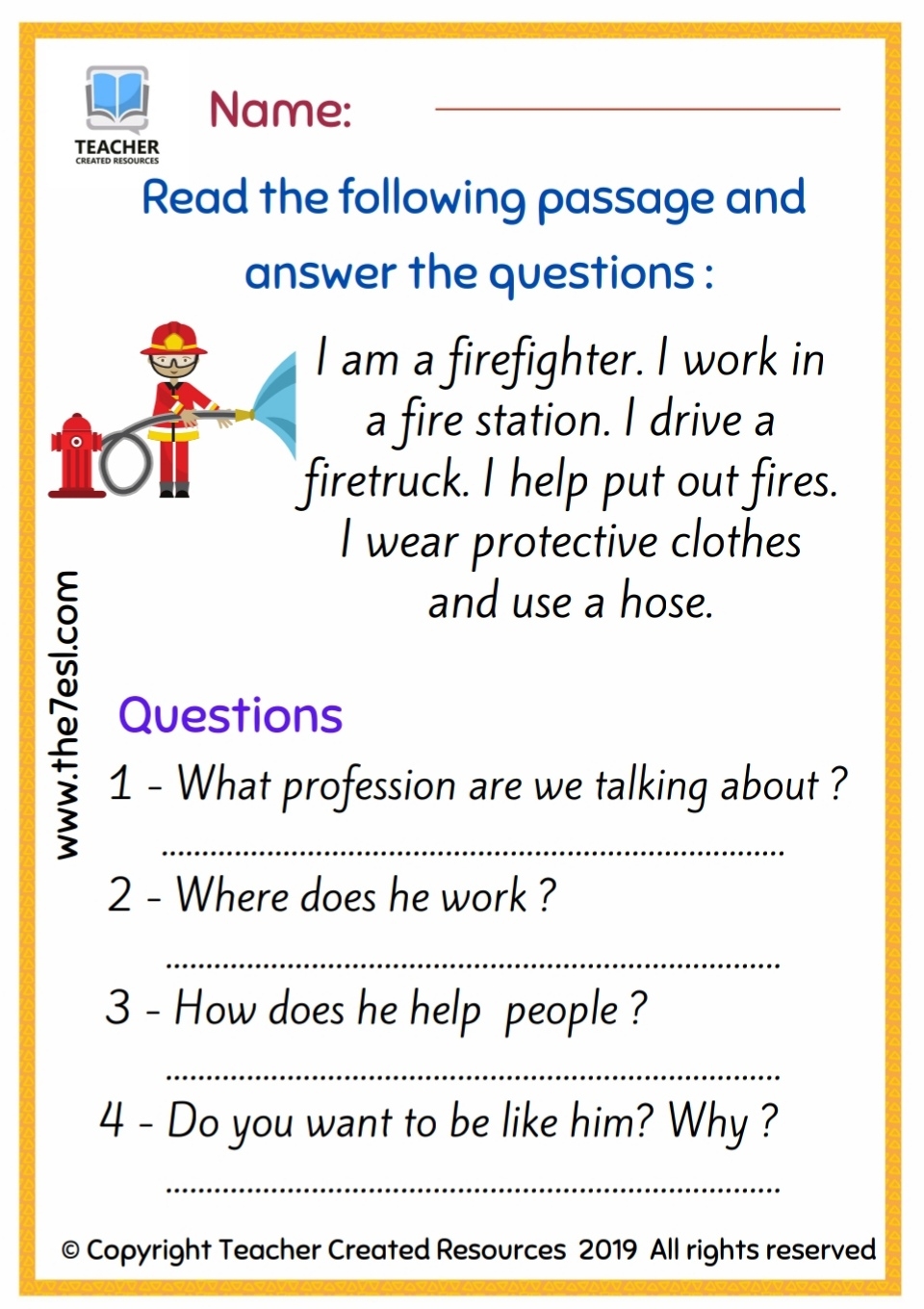 Reading Comprehension Professions English Created Resources