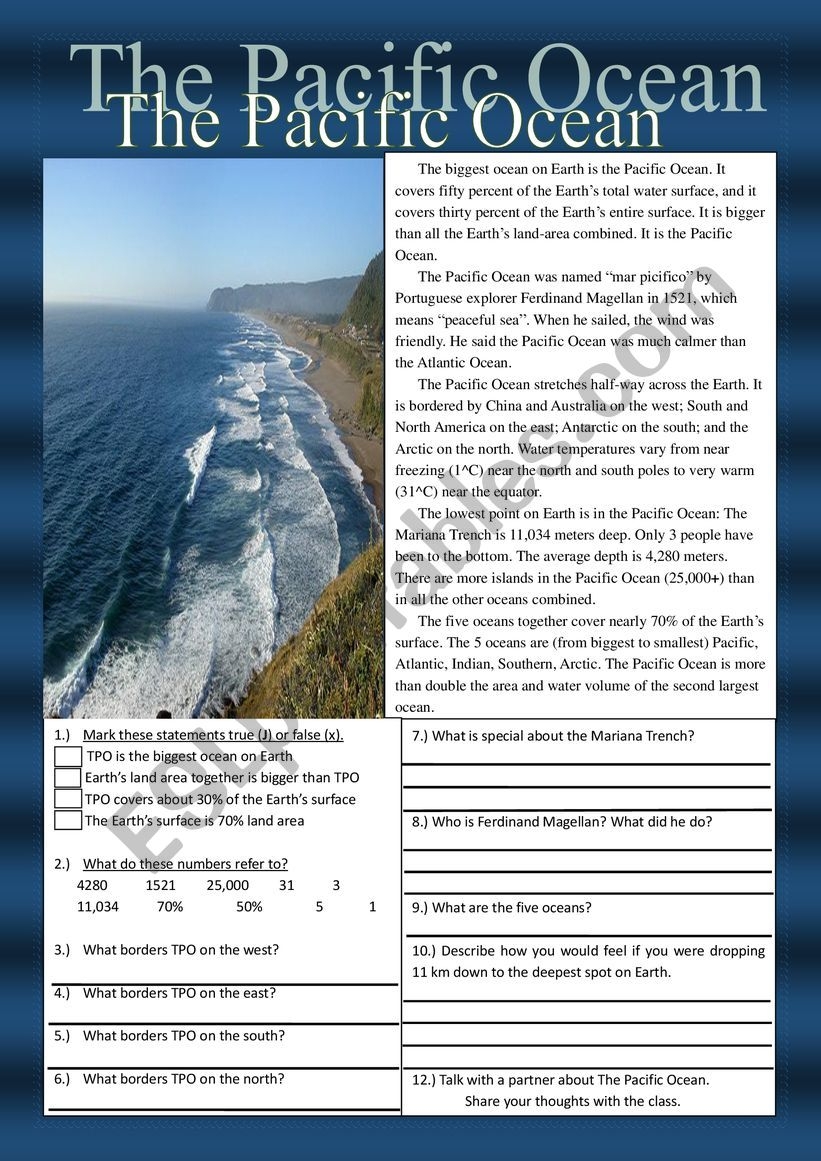 The Pacific Ocean Reading Comprehension Practice Exercises ESL Worksheet By Teacherblake