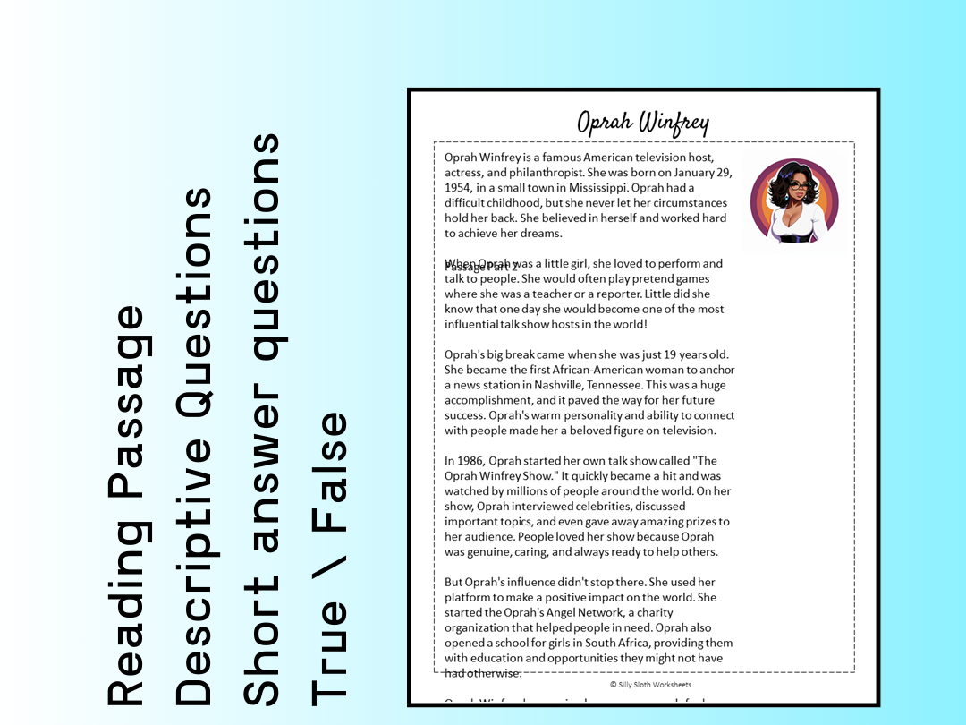 The worksheet includes a variety of reading passages about Oprah Winfrey, followed by comprehension questions to test students’ understanding. From her humble beginnings to her successful career in media and philanthropy, students will learn about Oprah’s journey to success and the obstacles she overcame along the way.