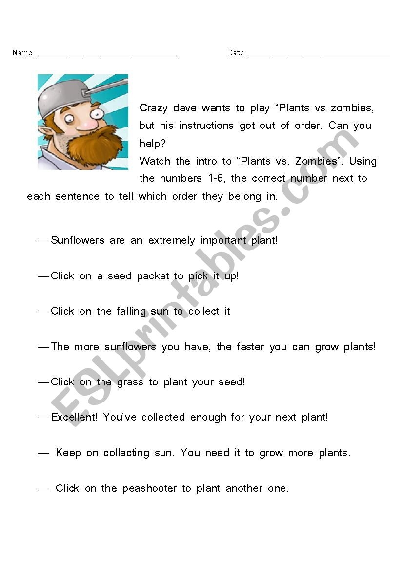 Plants Vs Zombies Ordering Worksheet ESL Worksheet By KBANAA