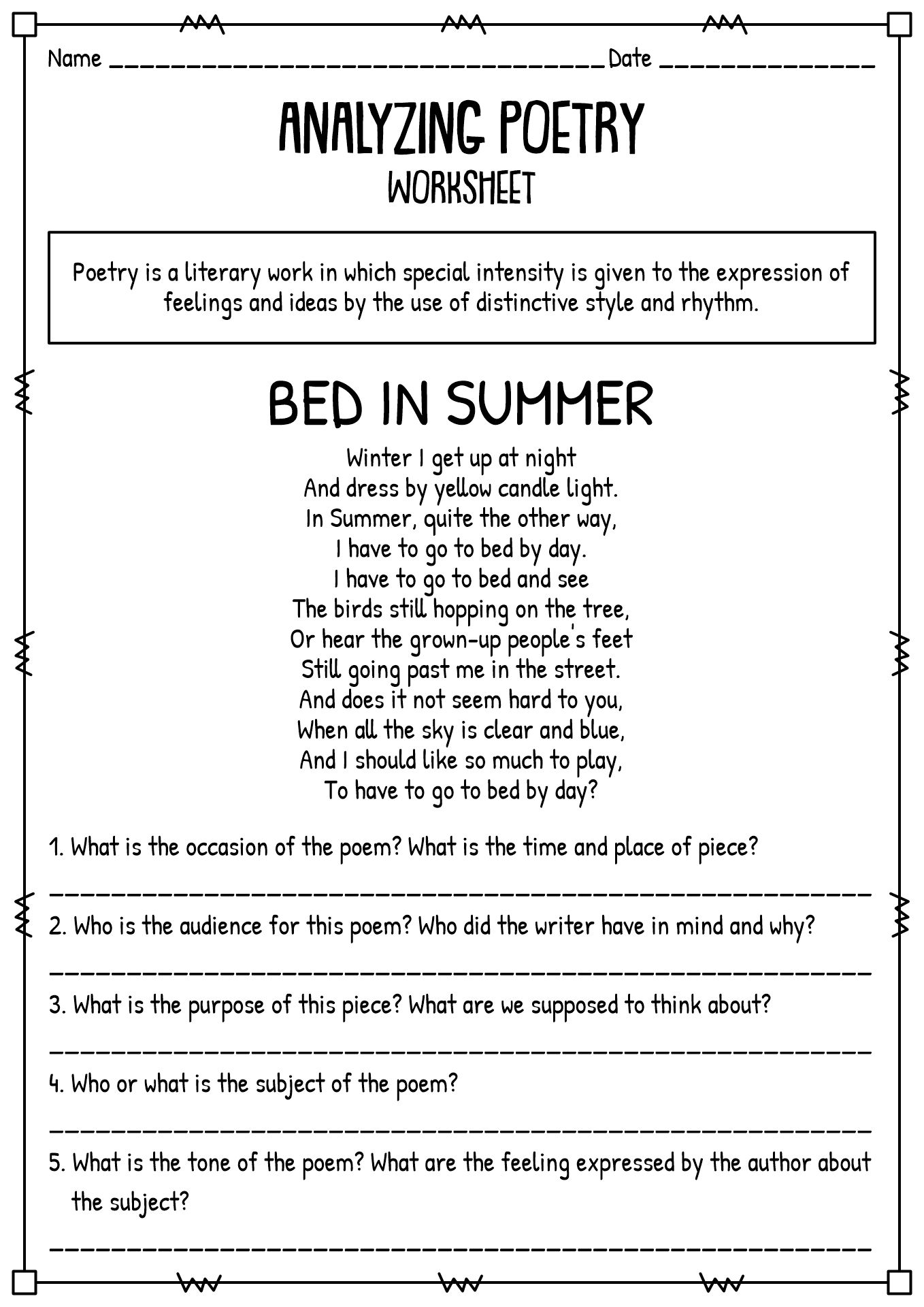 These worksheets often include questions and activities that prompt students to think deeply about the themes, tone, and structure of the poems they are reading. They may also require students to write their own poems or analyze famous works by well-known poets.
