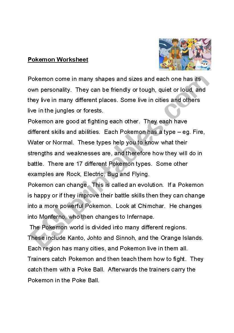 Pok mon Reading Comprehension ESL Worksheet By Lola rivero