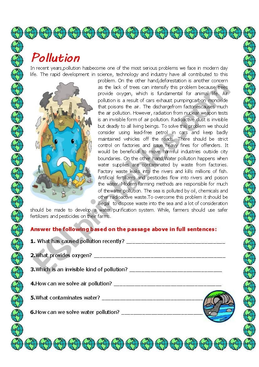 Pollution Reading Test Comprehension Language Writing ESL Worksheet By Chafik Boufrioua