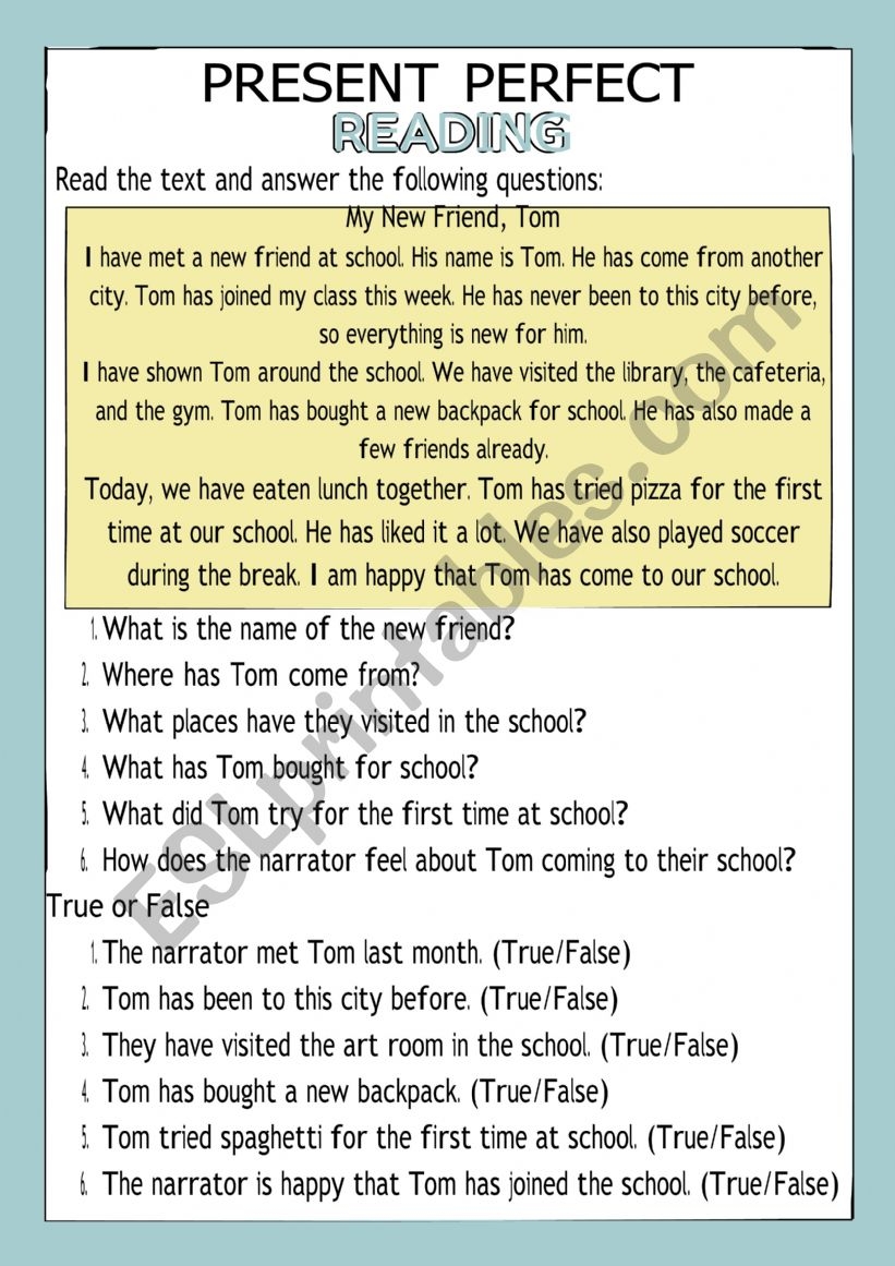 READING PRESENT PERFECT ESL Worksheet By Spanish2