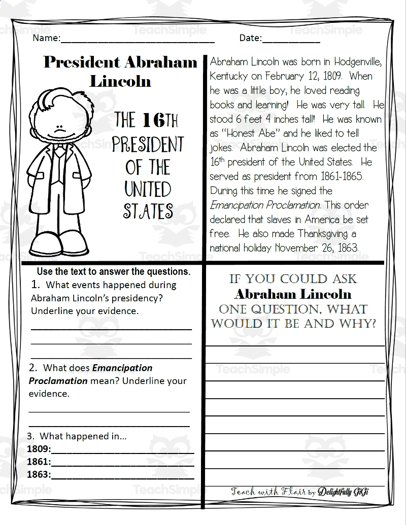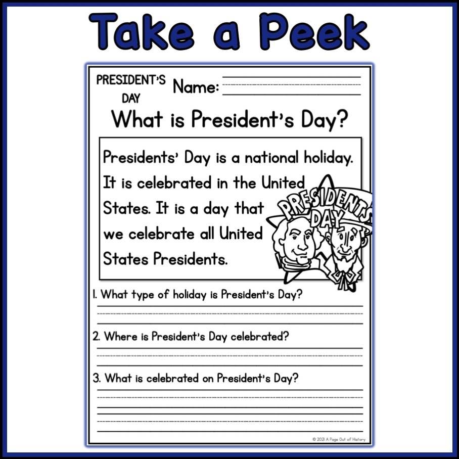 Each worksheet comes with a series of questions that test students’ understanding of the text. This helps to reinforce comprehension skills and encourages critical thinking. Students will have fun while learning about the history behind Presidents Day.