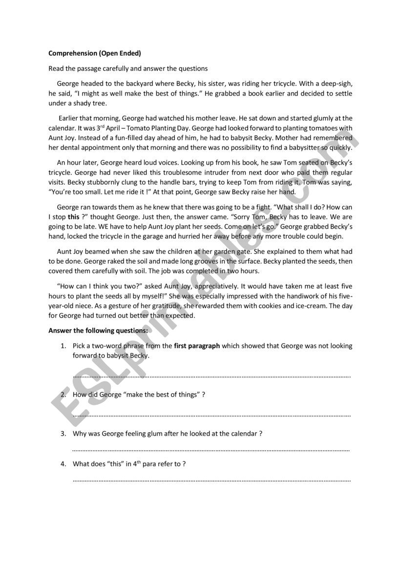 Open Ended Comprehension ESL Worksheet By Romman
