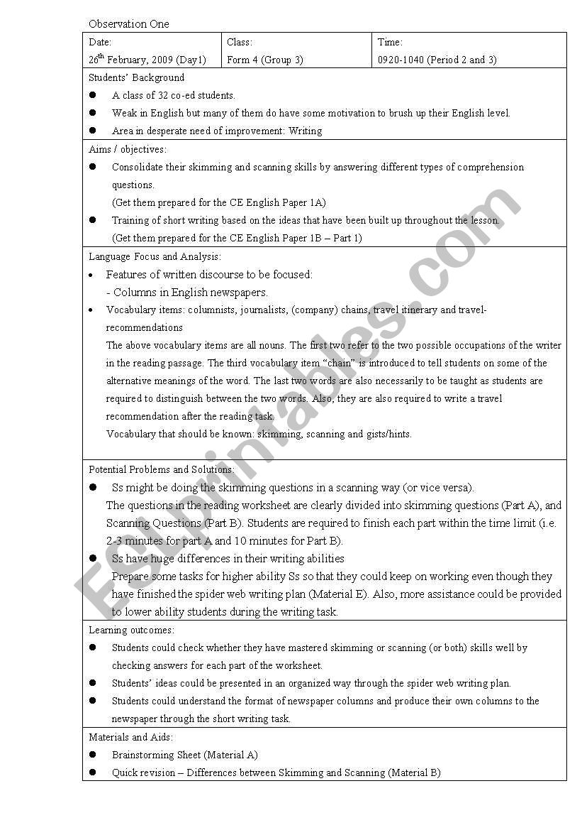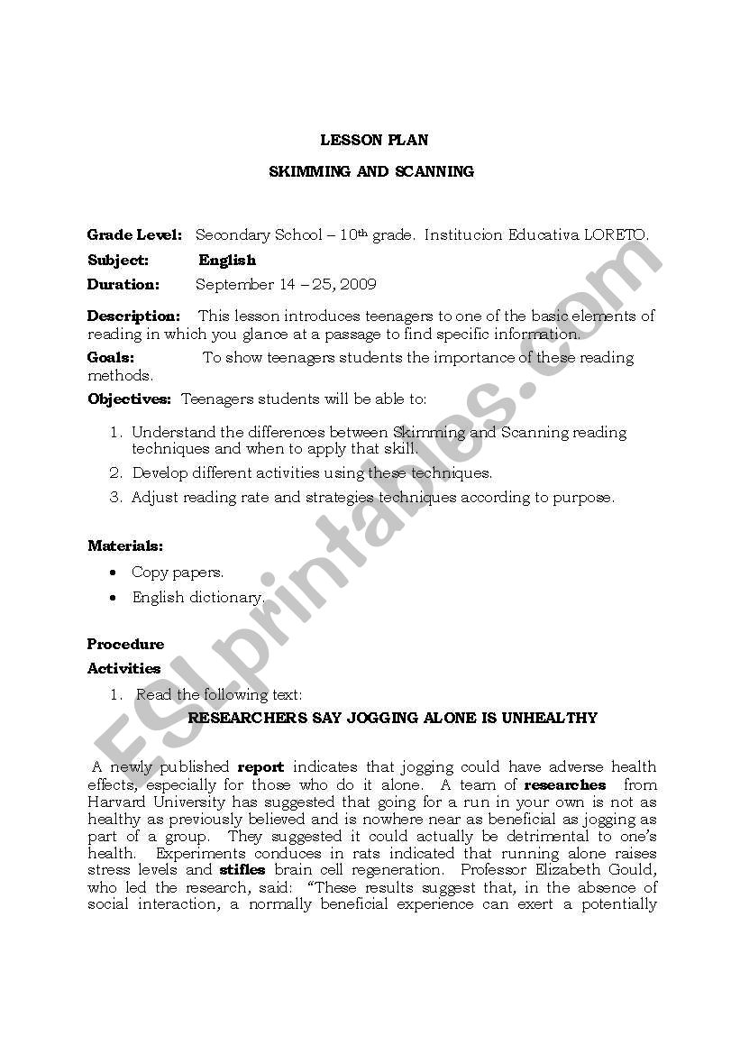 Lesson Plan On Skimming And Scanning Plus Writing Activities ESL Worksheet By Wailaam1