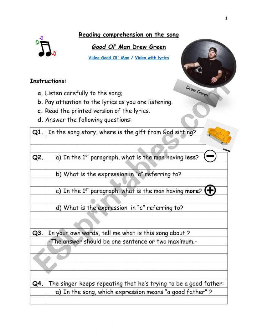 Reading Comprehension On The Song Good Ol Man By Drew Green ESL Worksheet By Racinej