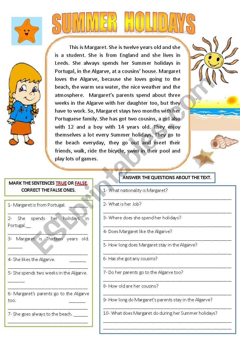 SUMMER HOLIDAYS READING AND COMPREHENSION ESL Worksheet By Sandytita