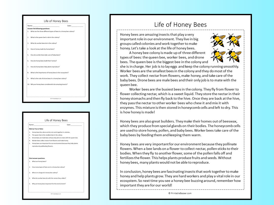 Life Of Honey Bees Reading Comprehension Passage Printable Worksheet Teaching Resources
