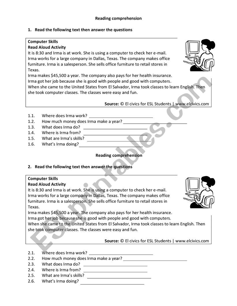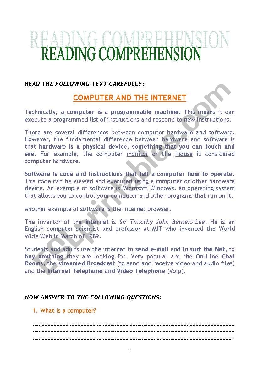 Reading Comprehension Worksheet About Computers
