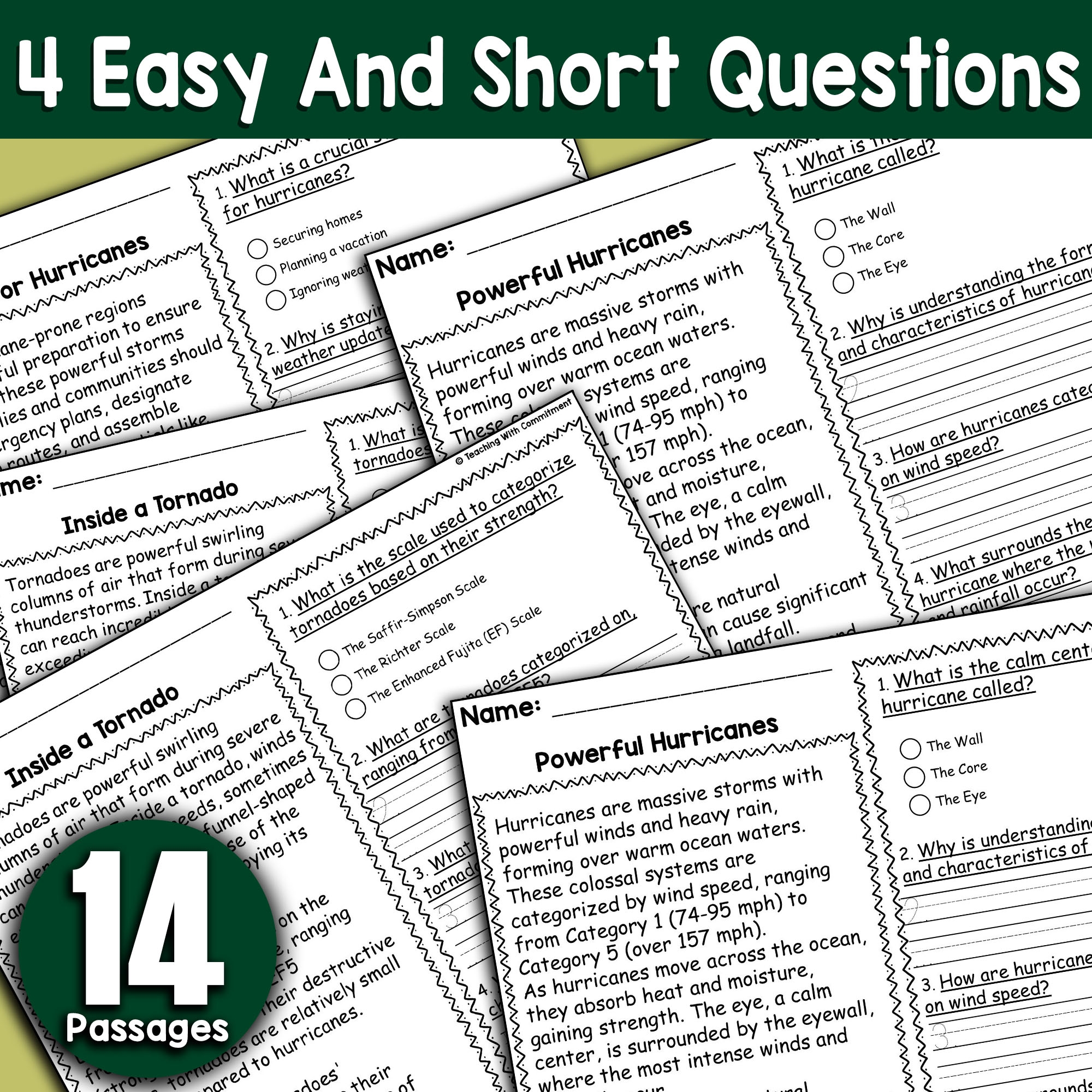 The worksheet includes passages about the differences between hurricanes and tornadoes, how they are classified, and the impact they can have on communities. Students will also answer questions to test their understanding of the material.