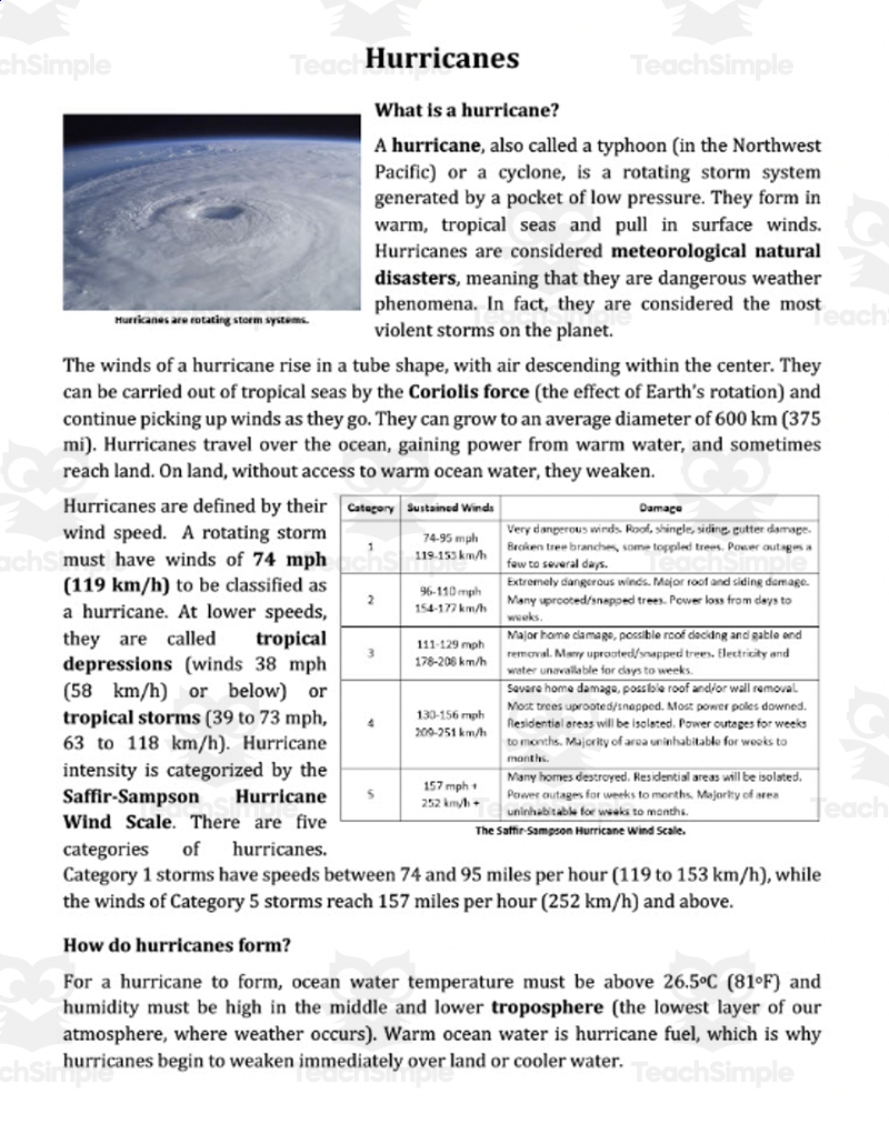 Hurricanes Reading Comprehension Article