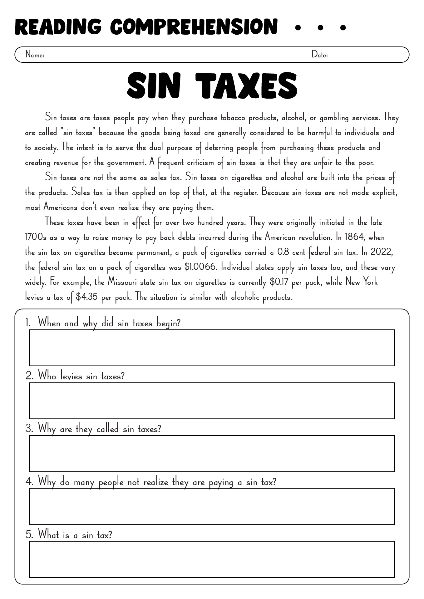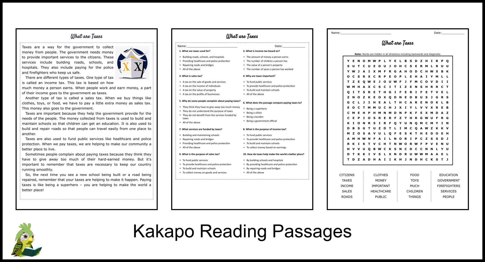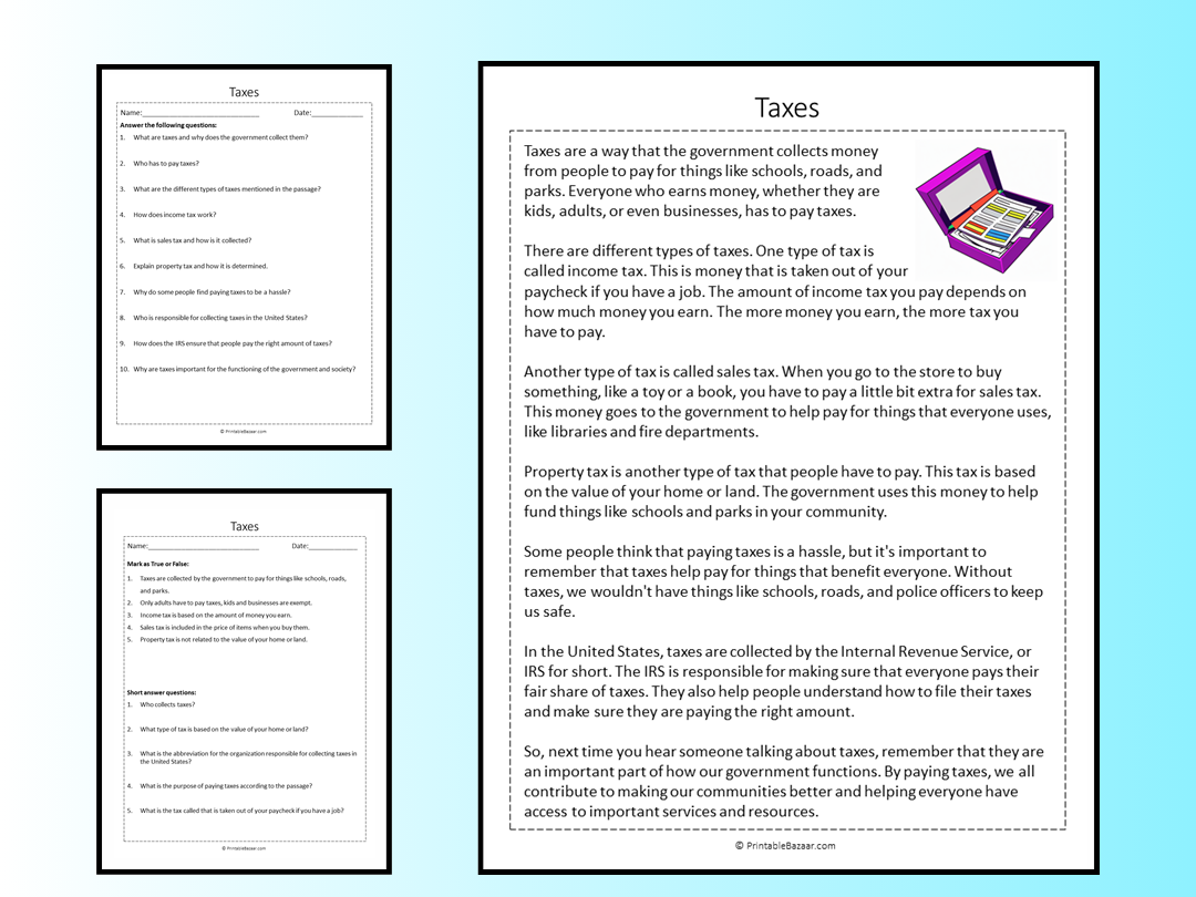 Our worksheet includes engaging passages that explain the concept of taxes in a simple and easy-to-understand way. Students will answer questions to test their understanding and reinforce key concepts.