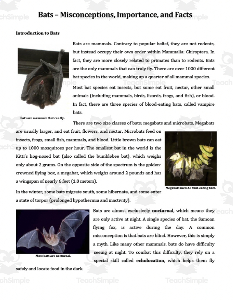 These worksheets typically include passages about bats followed by questions that test comprehension. Students can practice their reading skills while learning about the unique characteristics and behaviors of bats.