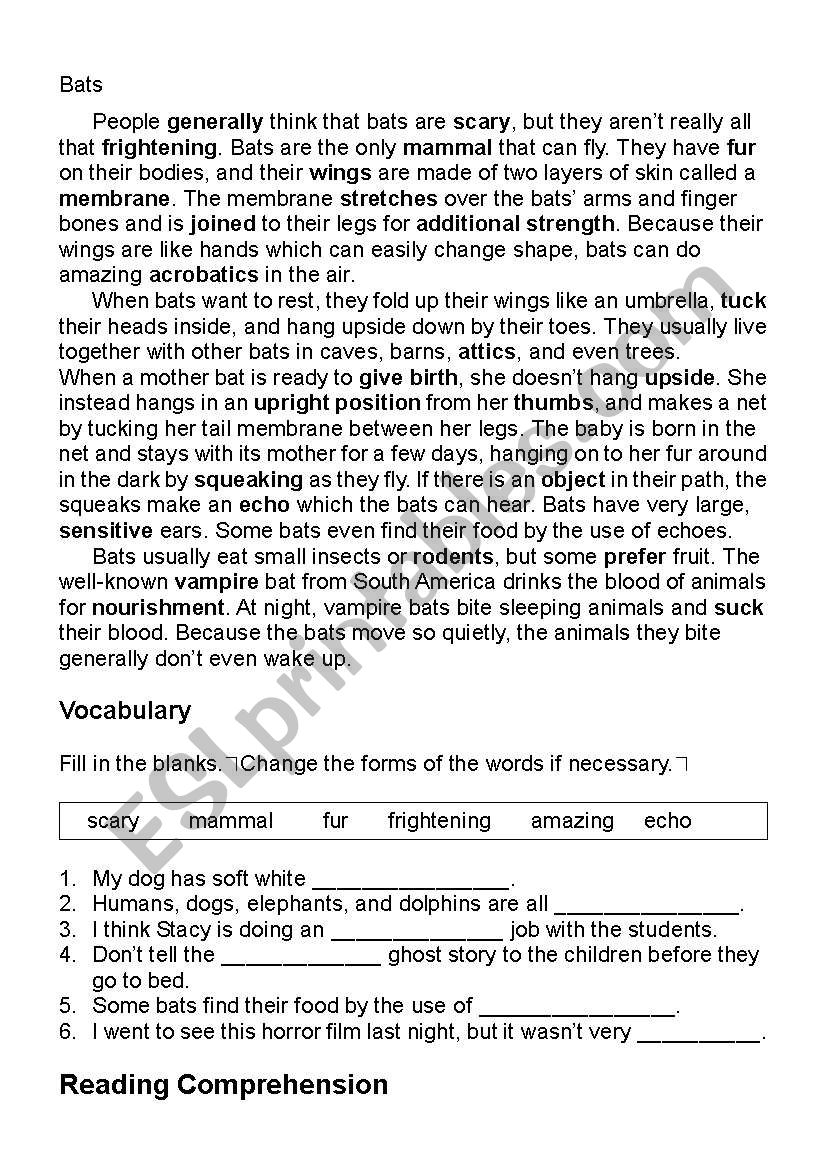 Bats Reading Comprehension ESL Worksheet By Kangaroo1106
