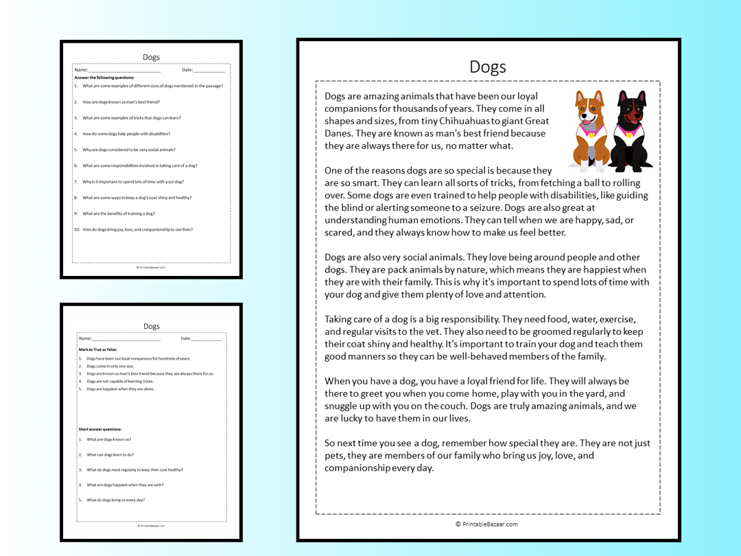 These worksheets typically contain a variety of passages about different aspects of dogs, ranging from their history and behavior to fun facts and care tips. By reading these passages and answering questions about them, students can enhance their ability to understand and analyze written information.