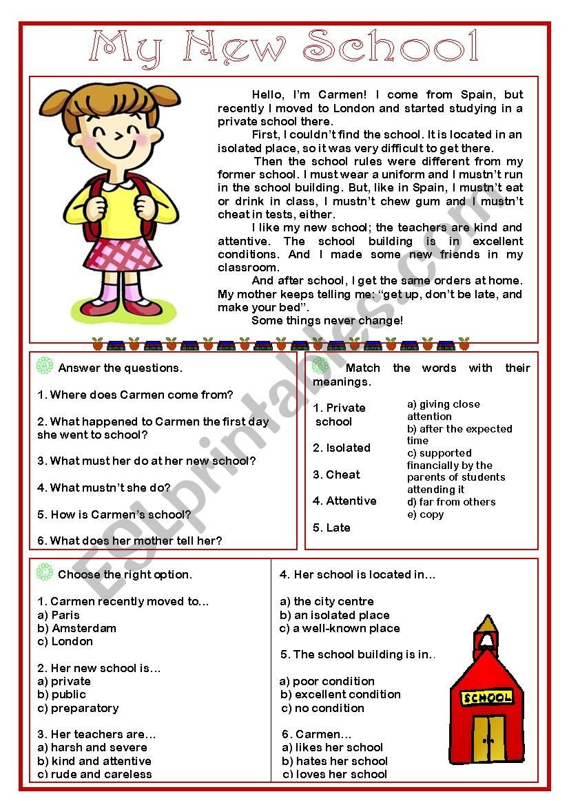 My New School Reading Comprehension ESL Worksheet By Sarasantos