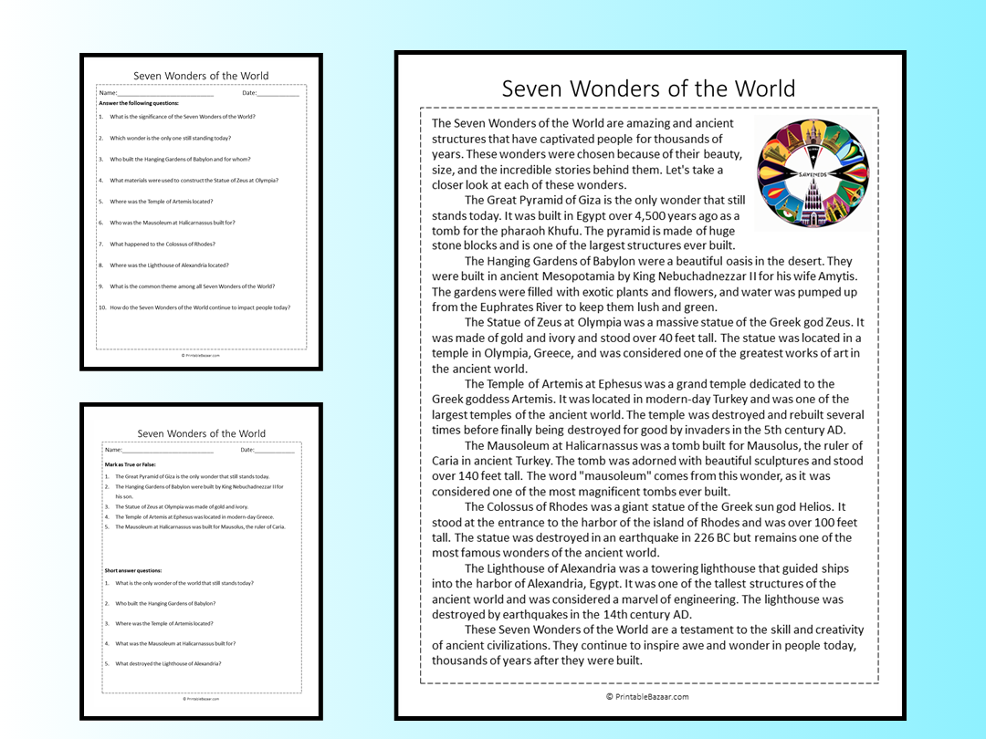 Seven Wonders Of The World Reading Comprehension Passage Printable Worksheet Teaching Resources