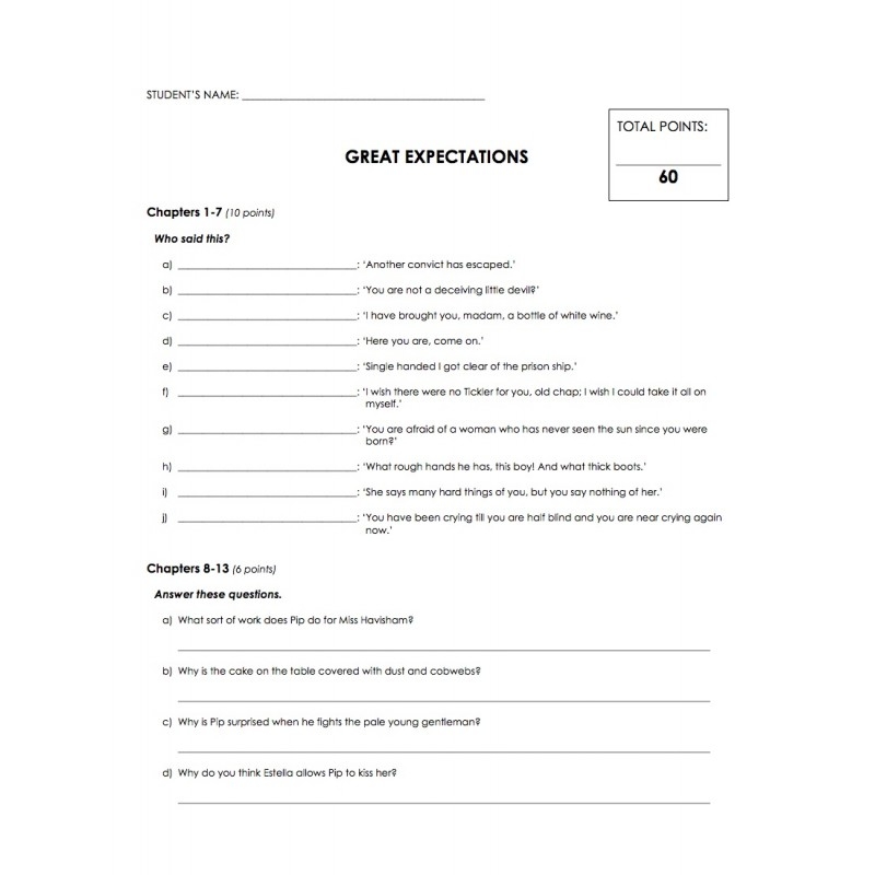 By working through these worksheets, you’ll delve deep into the plot, characters, and themes of “Great Expectations.” From analyzing Pip’s character development to exploring the symbolism of Miss Havisham’s decaying mansion, you’ll gain a deeper appreciation for Dickens’ masterpiece.