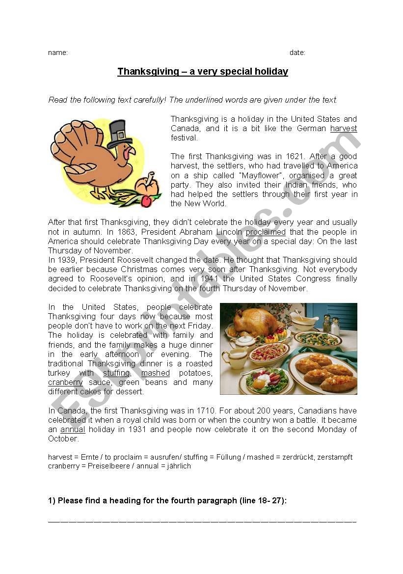 Thanksgiving Day Reading Comprehension ESL Worksheet By Kissnetothedit