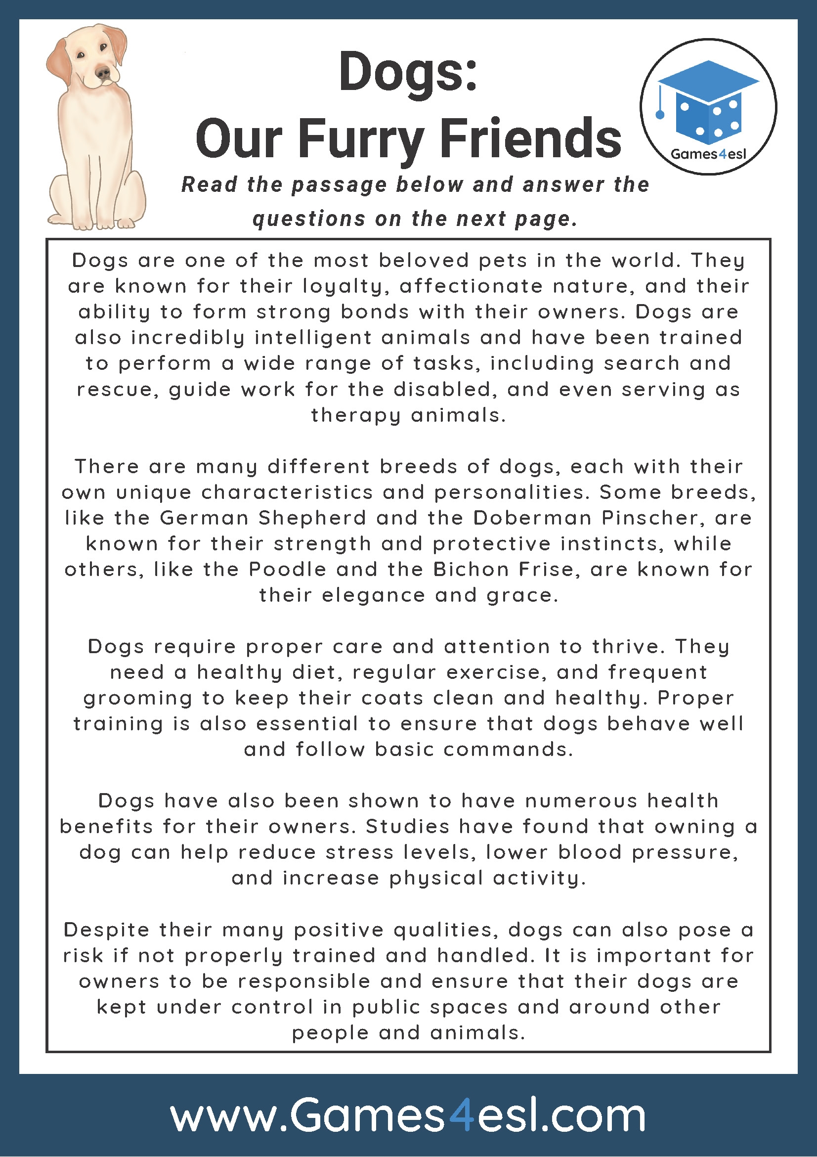 Dogs Reading Comprehension Worksheet Games4esl