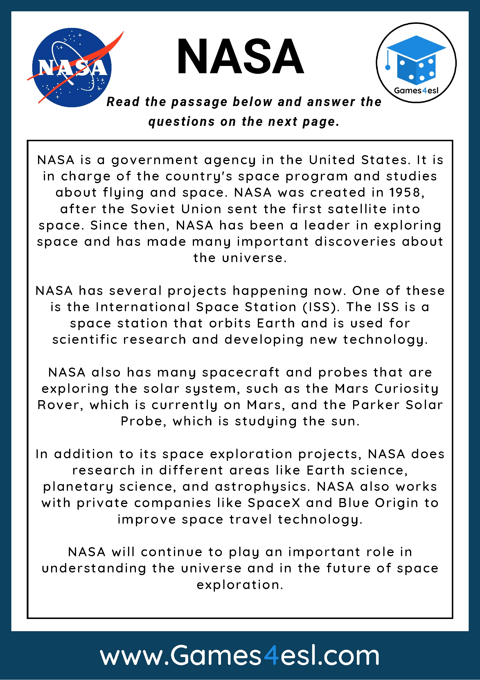 NASA Reading Comprehension Worksheet Games4esl