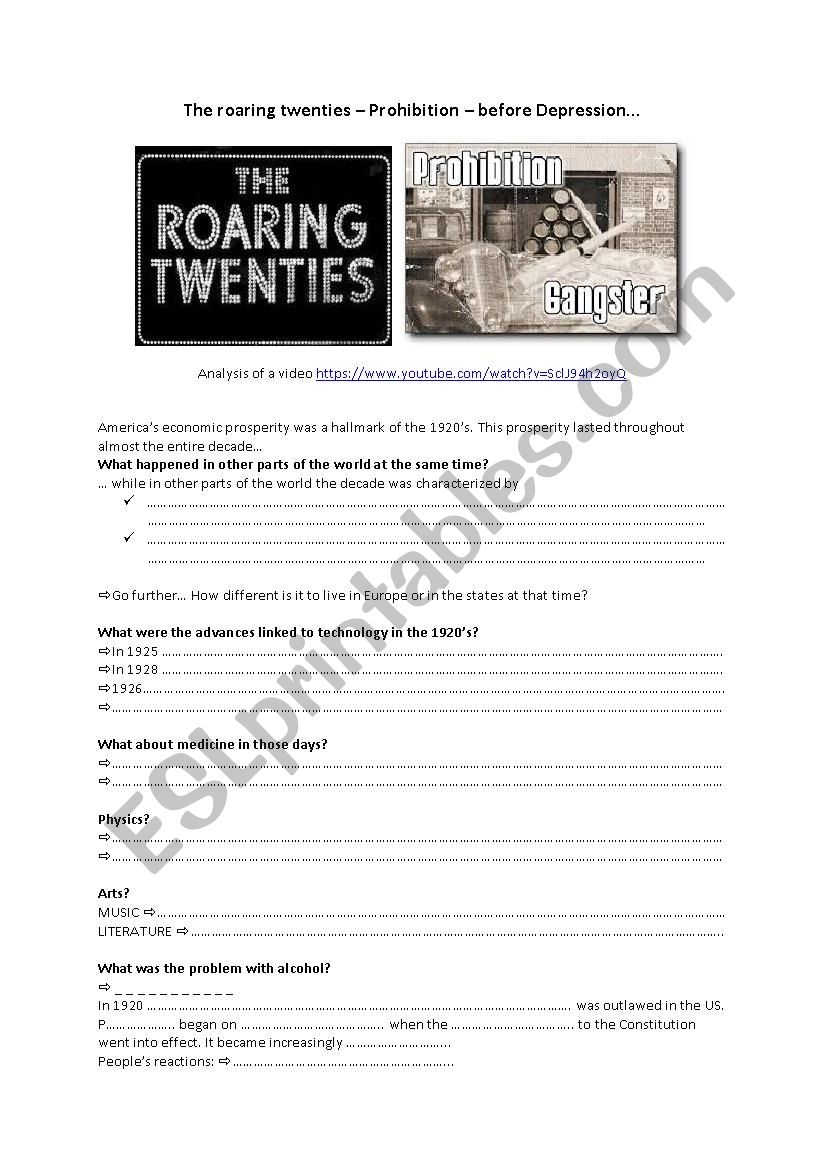 Roaring Twenties Prohibition Depression ESL Worksheet By Cvrin