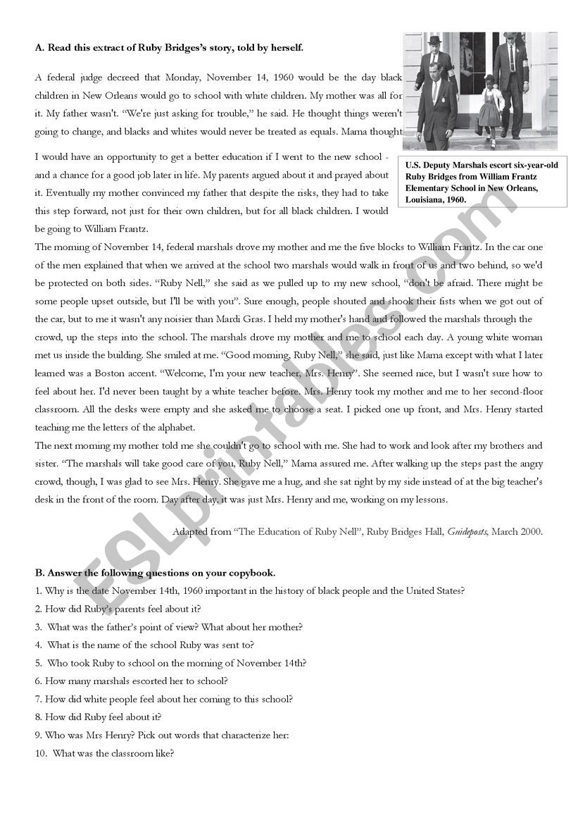 Ruby Bridges Reading Comprehension Worksheet ESL Worksheet By Candigrl31