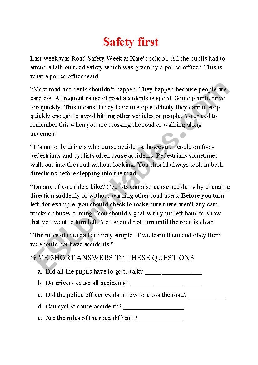 SAFETY FIRST Conprehension Reading ESL Worksheet By Dasha1055
