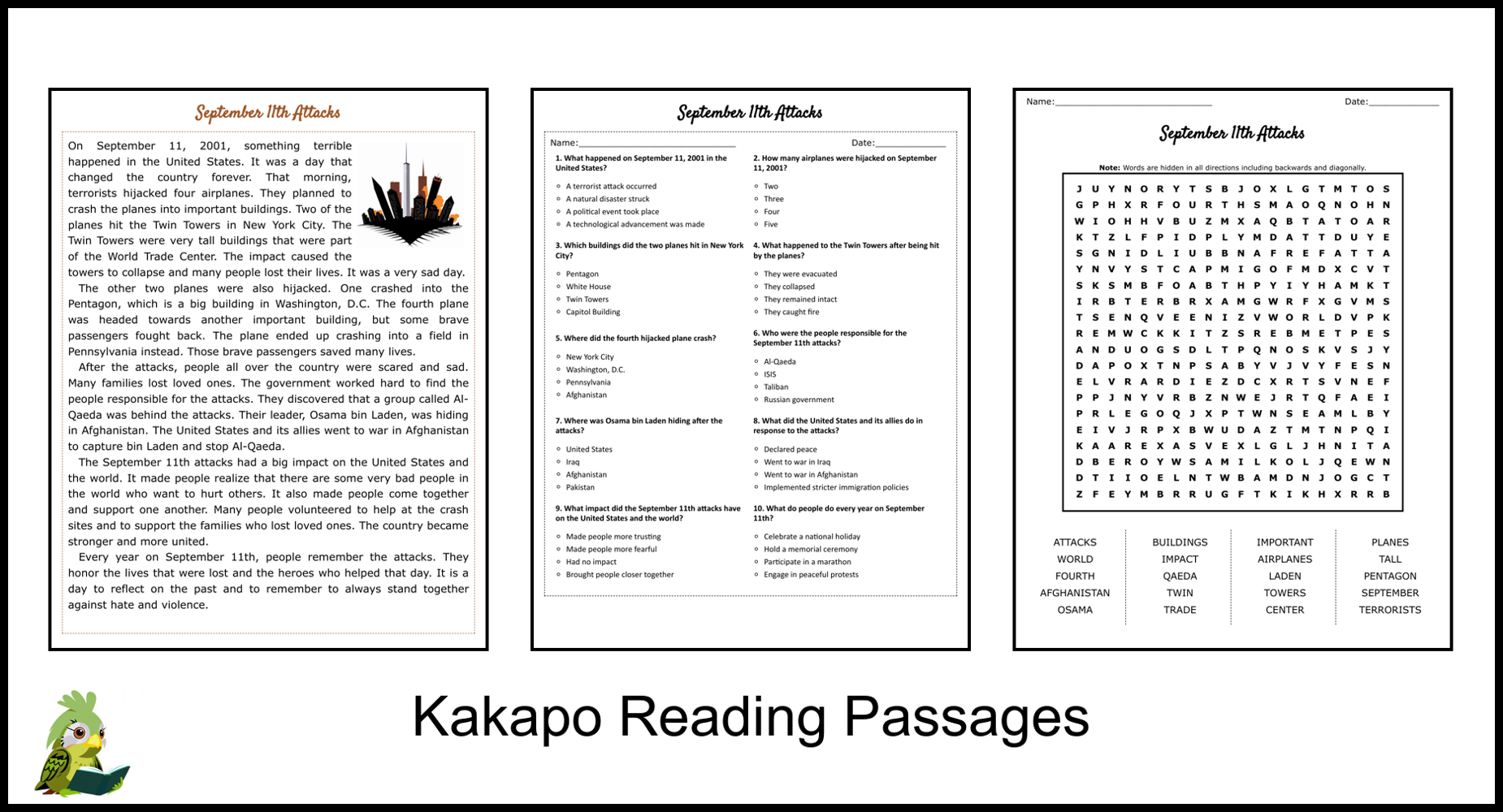 These worksheets include passages that discuss the events of September 11, the impact on the United States and the world, and the heroes who emerged during that tragic day. Students will enhance their reading comprehension skills while gaining a deeper understanding of this significant moment in history.