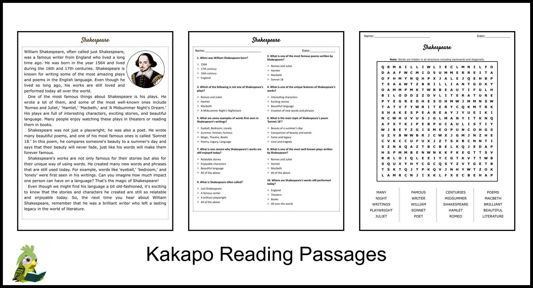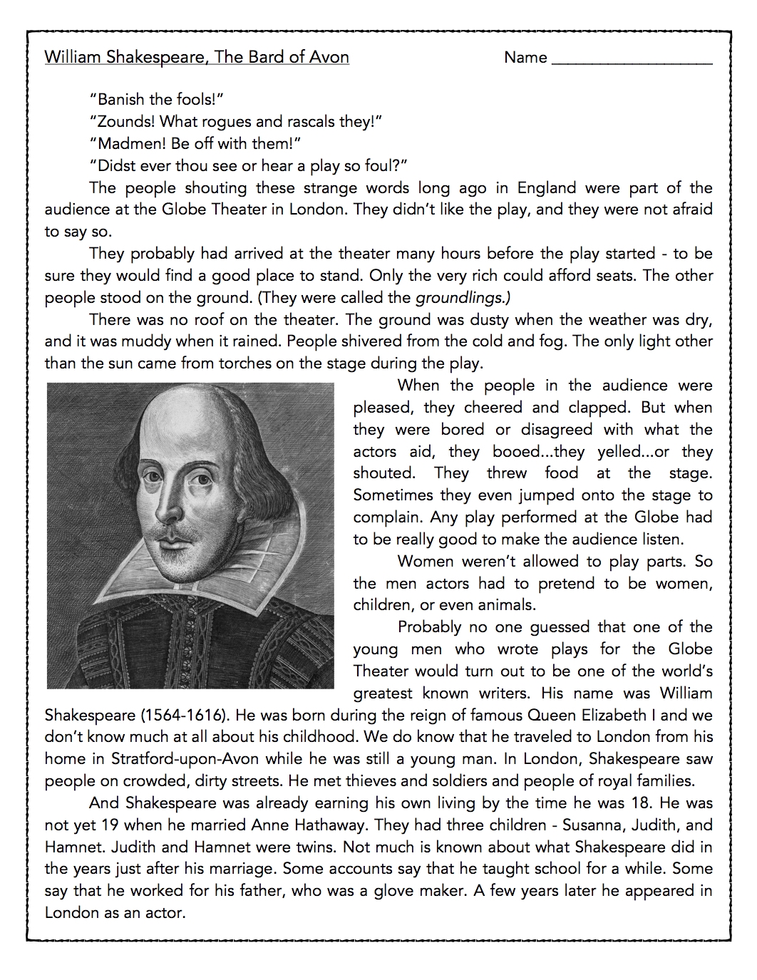 William Shakespeare Reading Comprehension Passage And Assessment Classful