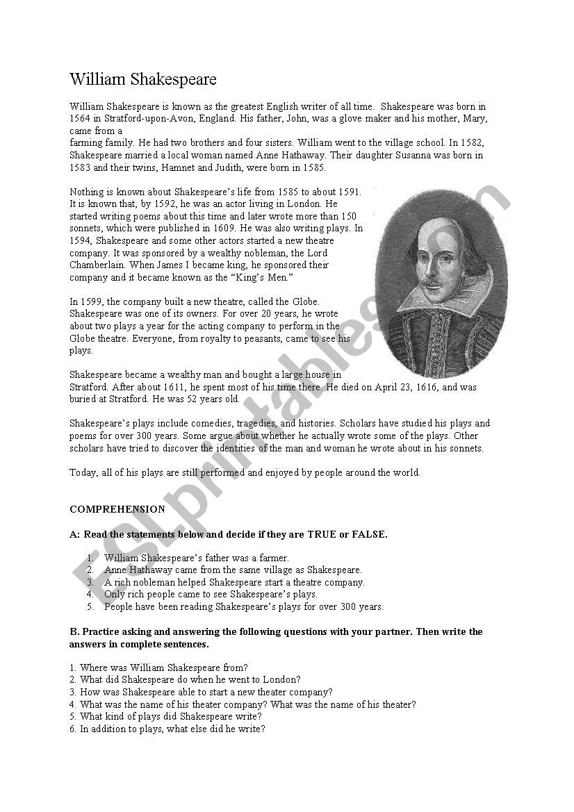 SHAKESPEARE S PORTRAIT READING COMPREHENSION WITH ANSWERS ESL Worksheet By Joebcn
