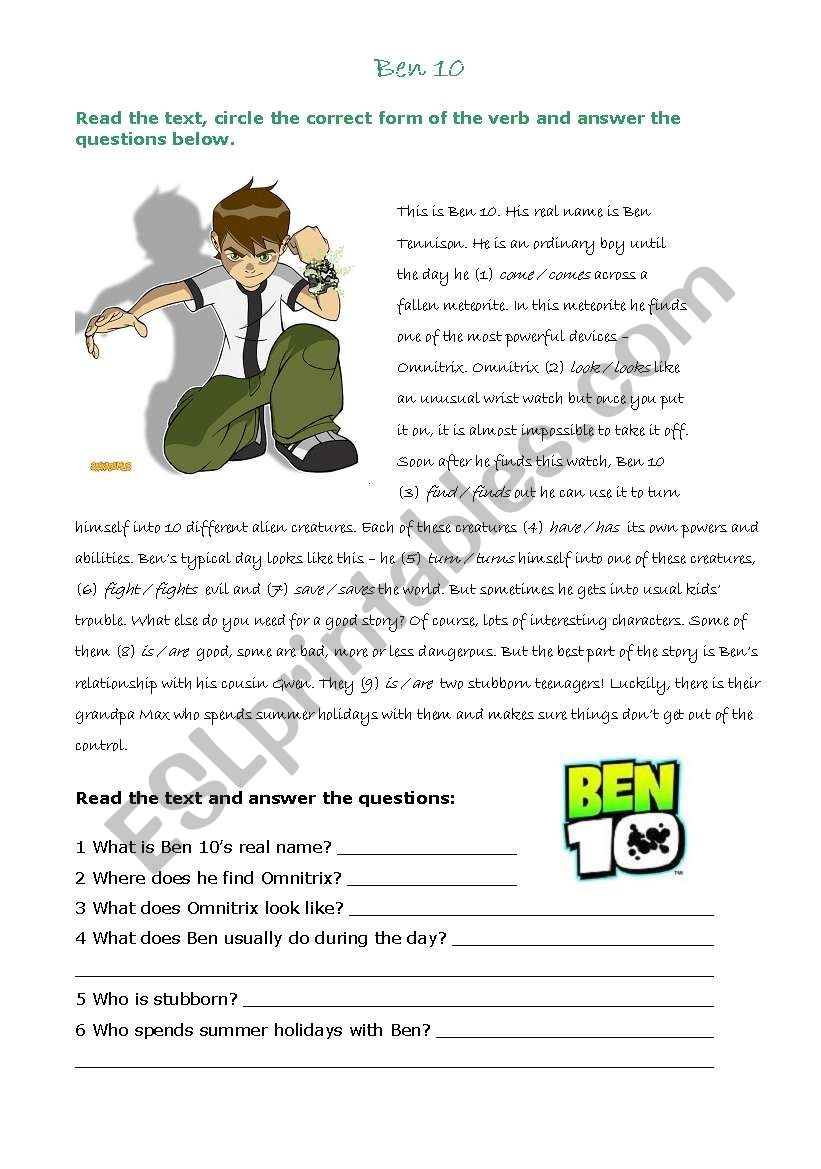 Ben 10 Reading Comprehension Simple Present Tense ESL Worksheet By Veljaca82