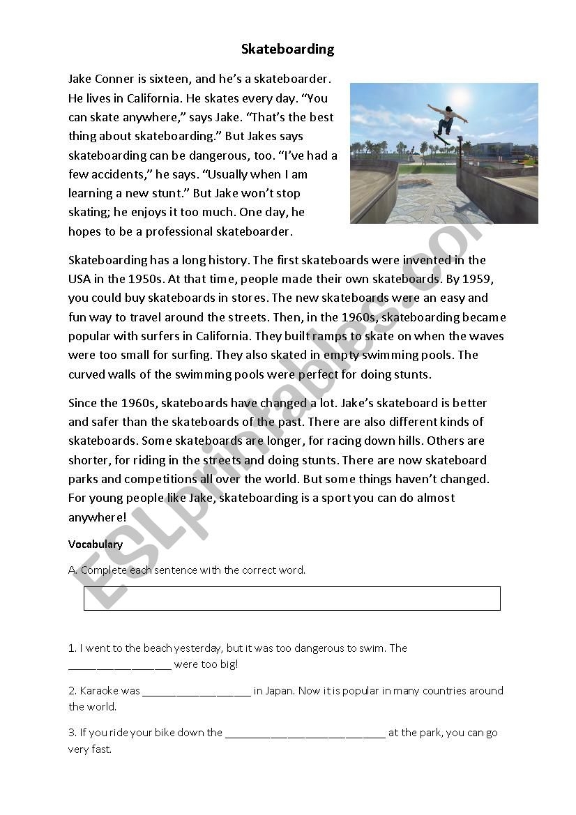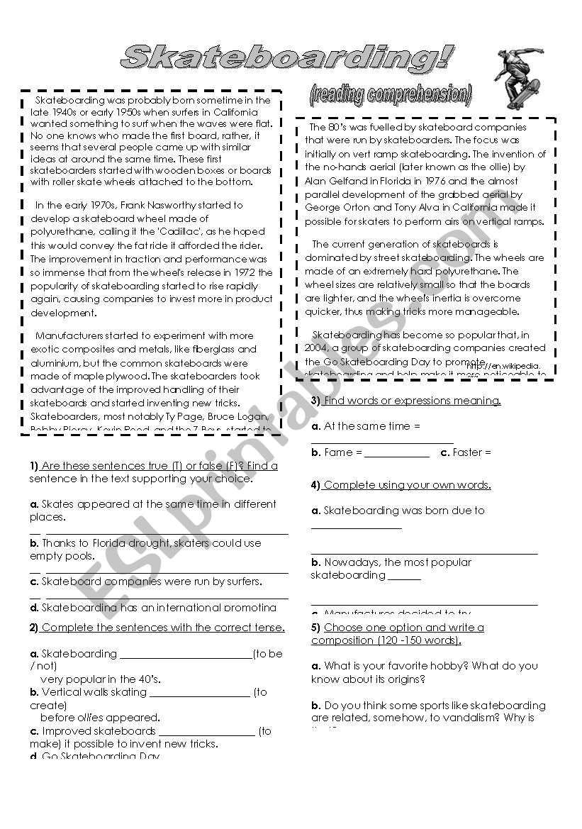 Skateboarding reading Comprehension ESL Worksheet By Claucosta