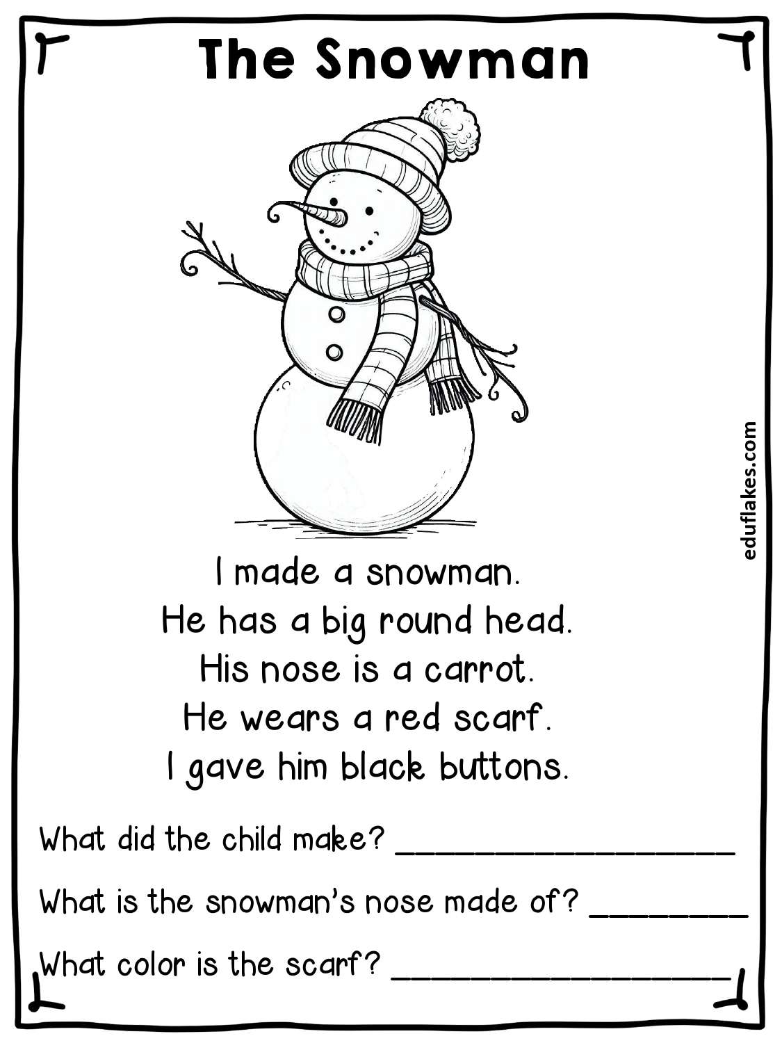 Snowman Reading Comprehension Worksheets For Kindergarten