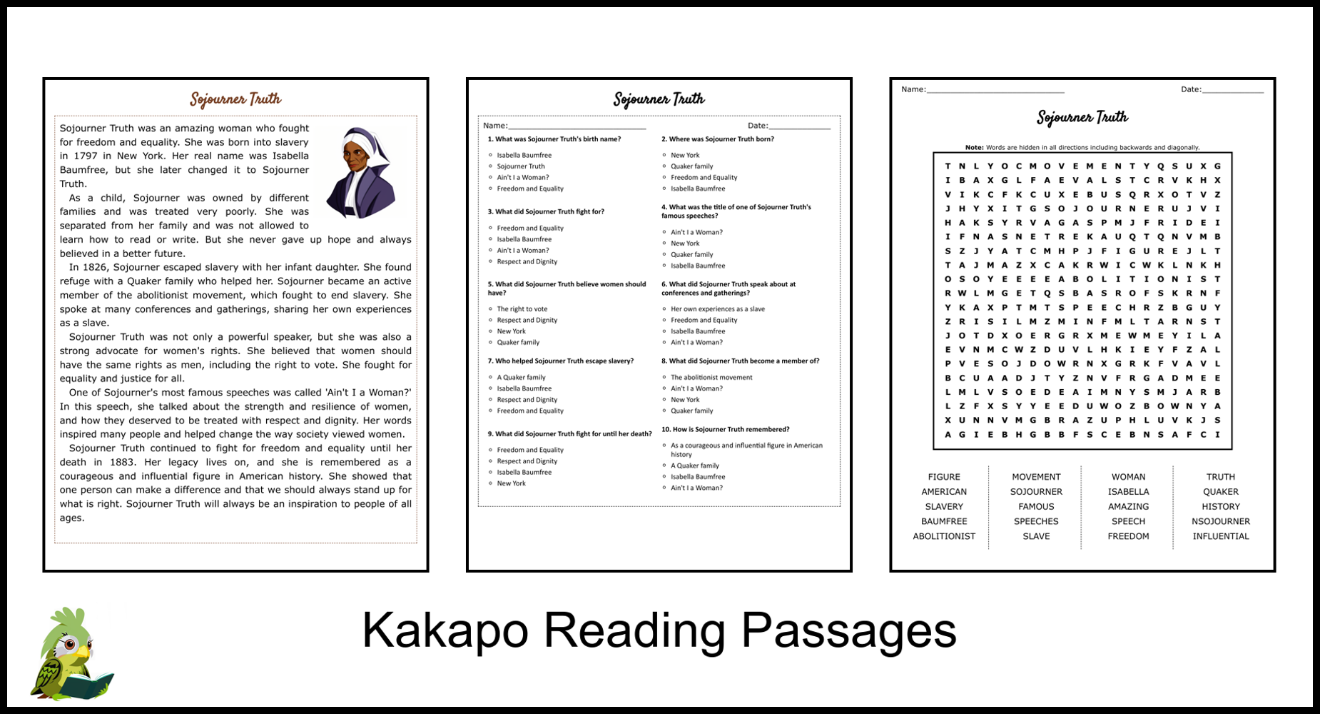 Sojourner Truth Reading Comprehension And Word Search Teaching
