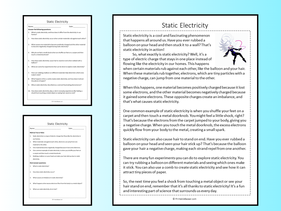Whether you are a teacher looking for a classroom activity or a parent wanting to supplement your child’s learning at home, our Static Electricity Reading Comprehension Worksheet is a valuable resource that is both educational and enjoyable.