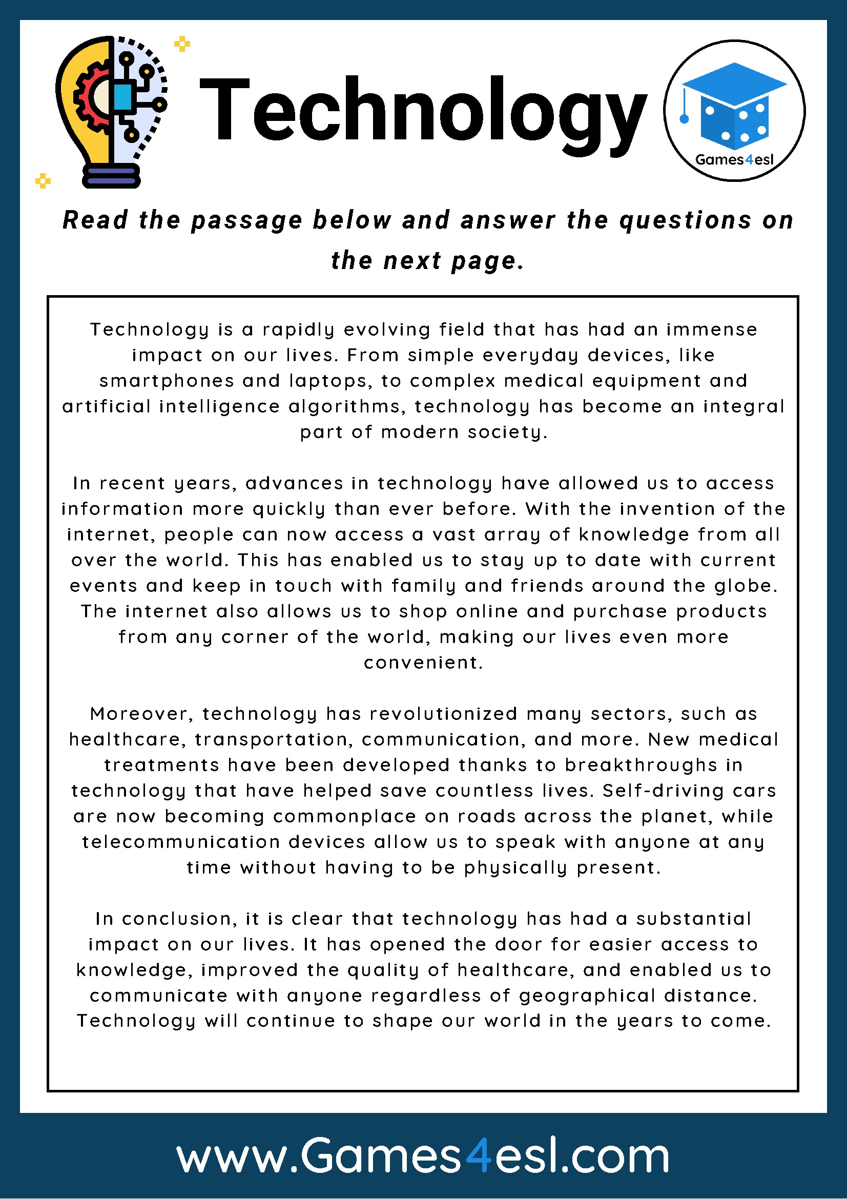 Technology Reading Comprehension Worksheet Games4esl