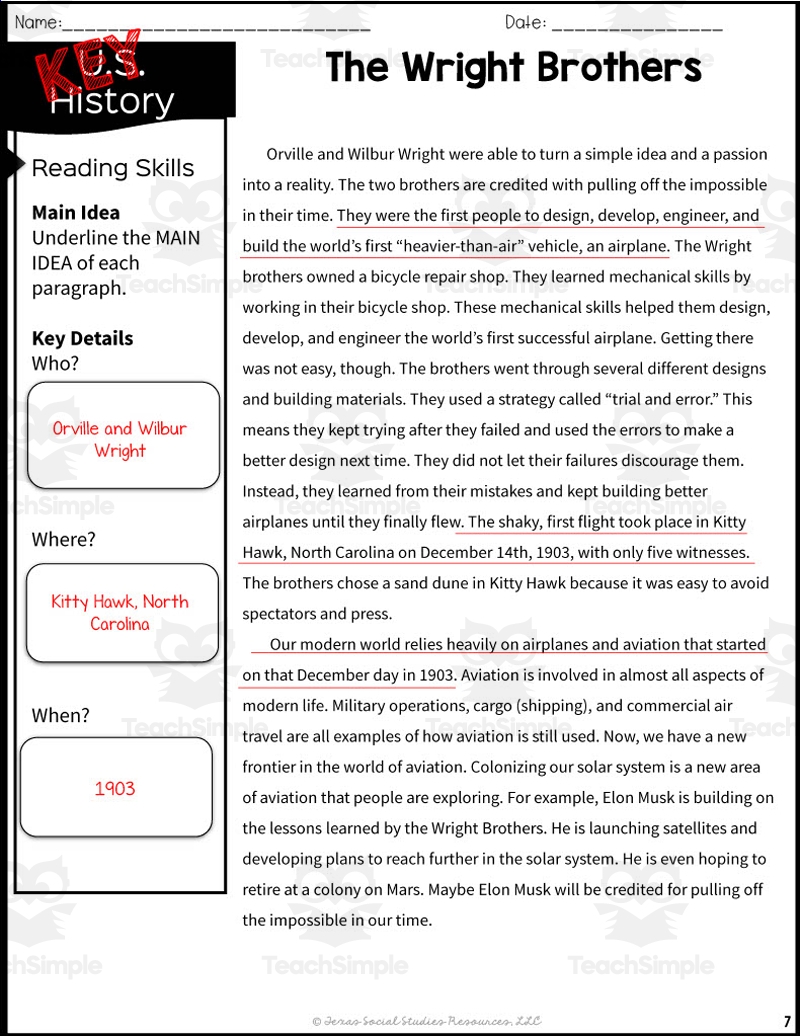 The Wright Brothers Reading Packet 5th Grade TEKS