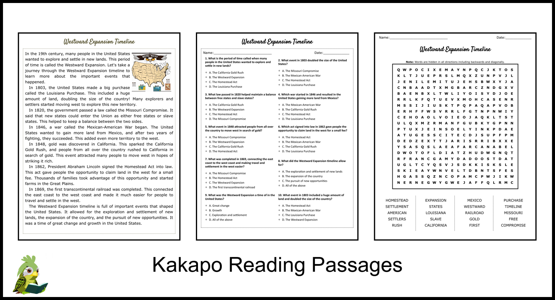 Westward Expansion Timeline Reading Comprehension And Word Search Teaching Resources