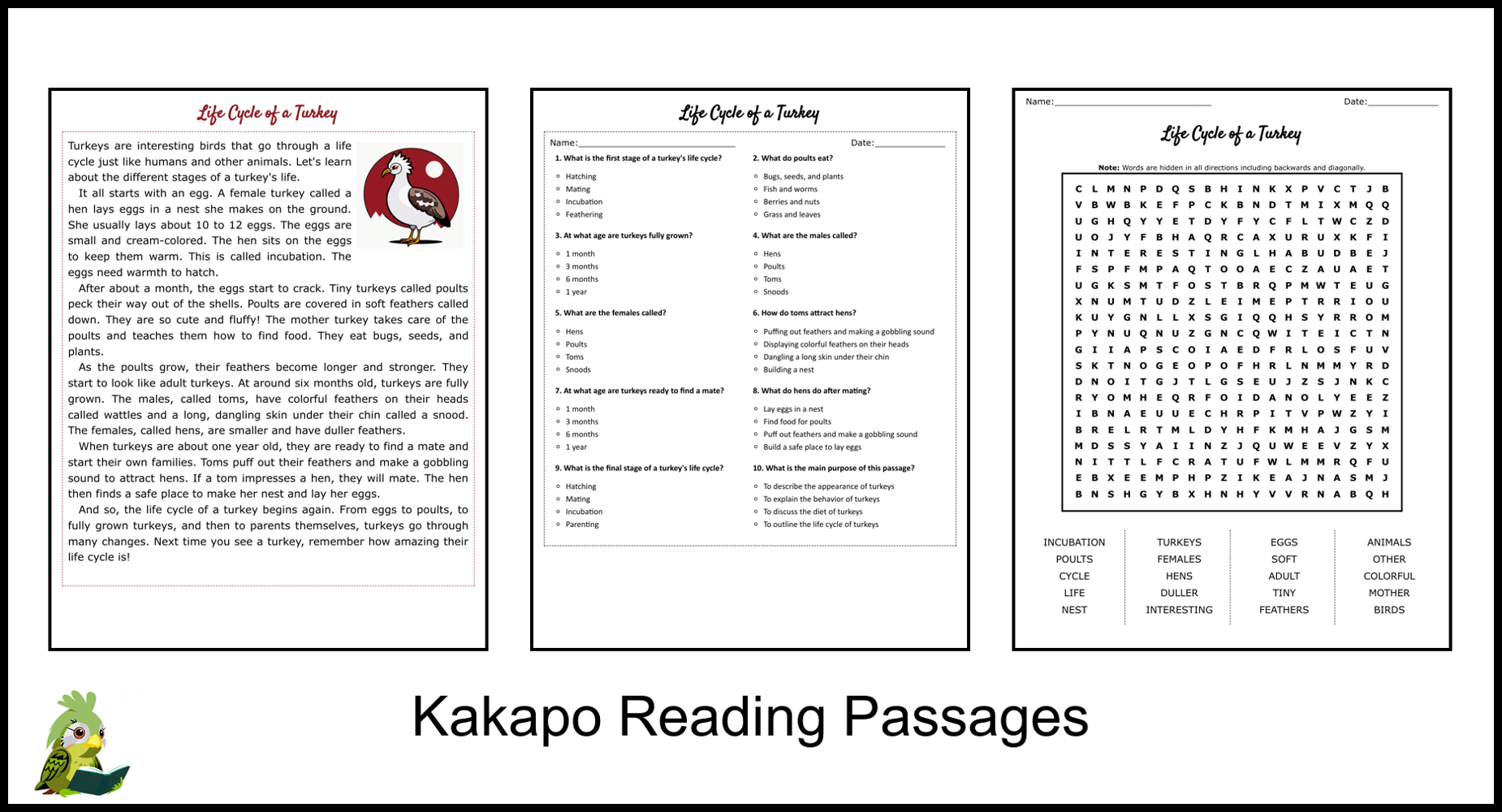 Life Cycle Of A Turkey Reading Comprehension And Word Search Teaching Resources