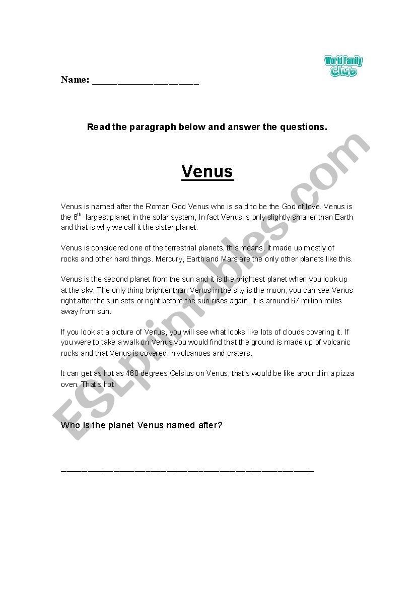 Planet Venus Reading Comprehension With Questions ESL Worksheet By Wfclub