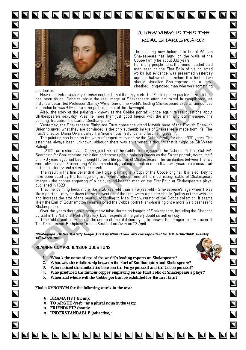 SHAKESPEARE S PORTRAIT READING COMPREHENSION WITH ANSWERS ESL