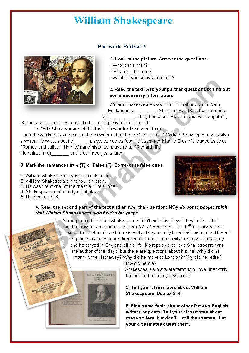 William Shakespeare Reading ESL Worksheet By Silvi85