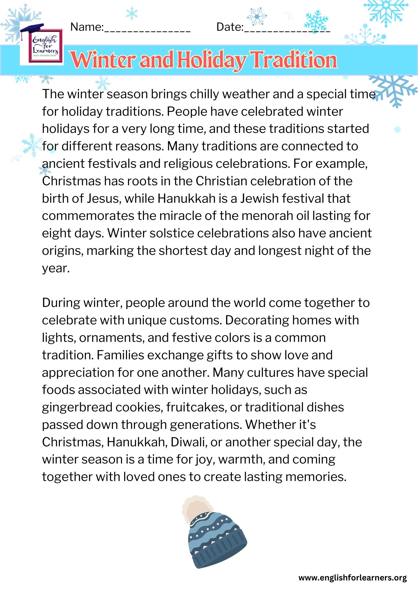 Reading Comprehension Practice Winter And Holiday Tradition